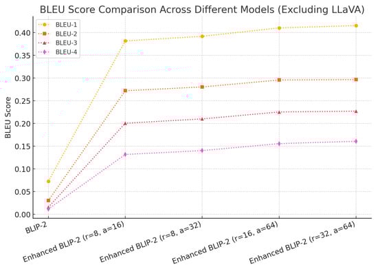 The BLEU score trends in Figure 4 show a clear upward trajectory as LoRA configurations improve. The fine-tuned enhanced BLIP-2 consistently outperformed the baseline BLIP-2, with superior fluency and lexical diversity of driving environment scene captions. Notably, as the LoRA rank (r) and scaling factor (a) increased, the BLEU-4 score improved, with the highest setting (r = 32, a = 64) having a score of 0.1609; this score was approximately 14 times that of the baseline BLIP-2.