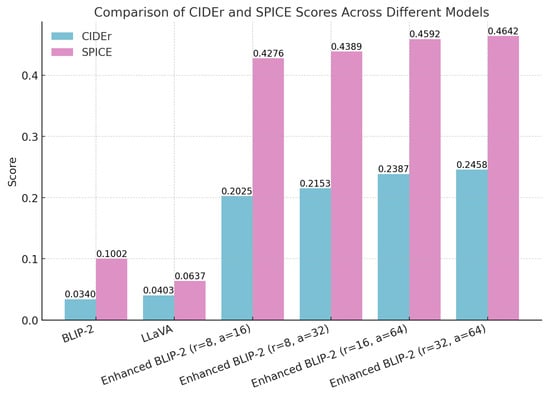 The improvements in CIDEr and SPICE scores, apparent in Figure 5, further show the effectiveness of LoRA-based fine-tuning for domain adaptation. The CIDEr score, which indicates the informativeness of captions, increased from 0.0340 (BLIP-2) to 0.2458 (enhanced BLIP-2, r = 32, a = 64). This suggests that fine-tuned models can produce captions that better capture the details of complex driving environments. Similarly, the SPICE score, which measures semantic correctness and scene understanding, shows a consistent rise, peaking at 0.4642, indicating that models fine-tuned using LoRA generated more contextually relevant captions and showed improved scene comprehension.