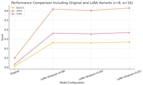 Figure 6 presents the results of experiments conducted under a fixed configuration of and , focusing on the impact of different dropout rates on model performance. The comparison highlights how varying the dropout value influences the effectiveness of LoRA-based optimization across BLEU-4, SPICE, and CIDEr metrics.