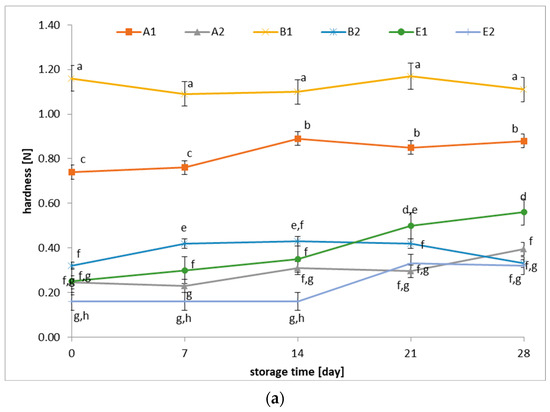 The hardness of fermented beverages varies depending on the type of lactic acid bacteria culture used and the base raw material (dairy, dairy–oat, and oat). Dairy and dairy–oat products exhibit better stability and higher hardness than oat beverages, confirming the research hypothesis of a positive impact of lactic acid bacteria cultures on the quality of fermented beverages. Groups A1 and B1 have the highest hardness values (~1.0–1.2 N) and do not show significant changes during storage (Figure 3a). It is suggested that the bacteria in these samples stabilize the beverage structure and ensure its durability. Group E1 shows a marked increase in hardness over time, reaching ~0.6 N at the end of storage, suggesting a gradual improvement in consistency. Beverages containing mixed cultures (probiotic monocultures and yogurt bacteria) are characterized by higher hardness, suggesting a beneficial effect on consistency. Samples E2, B2, and A2 initially exhibit the lowest hardness values (~0.1–0.3 N), but they gradually increase in the case of E2 and B2. It may indicate that fermentation in these groups was less effective at the beginning, but the structure gradually stabilized during storage.