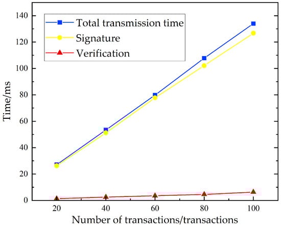 To further validate the feasibility of the model, the total transmission time, signature time, and verification time were tested for transaction volumes of 20, 40, 60, 80 and 100 in the account model, as shown in Figure 3. The experimental results indicate that as the number of transactions increases, the total transmission time grows linearly, aligning with the expected data transmission performance of the CLSC_SAT model under large-scale transactions. Additionally, the signature time is higher than the verification time, which is attributed to the greater complexity of the signature algorithm.