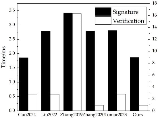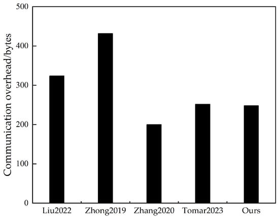 To compare the commonalities of various schemes, this paper focuses solely on the size of the signatures. A comparison of communication overhead with the literature is presented in Table 7. It can be observed that the signature overhead in this study is the lowest, and the transmission overhead is only higher than that of reference [].