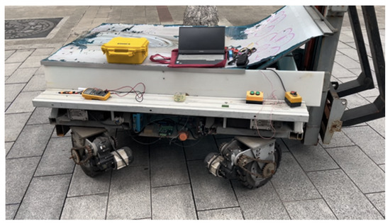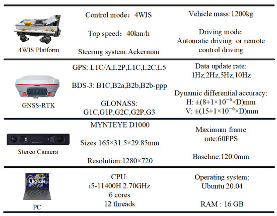 The experiments were conducted on a fully self-constructed experimental platform, as shown in Figure 5. The platform uses a four-wheel independent drive and four-wheel independent steering (4WID-4WIS) [33] control system, where each of the four wheels is equipped with independent steering and drive motors. A personal computer (PC) functions as the main controller, commanding the platform’s movement such as forward, backward, turning, and rotating in place via a mobile app. A stereo camera with a resolution of 1280 × 720 is mounted at the front of the platform, with an RTK measurement terminal positioned directly beneath it to determine the vehicle’s initial position and orientation, as well as to provide accurate RTK-measured landmark data. The specific details of the experimental setup are provided in Figure 6.