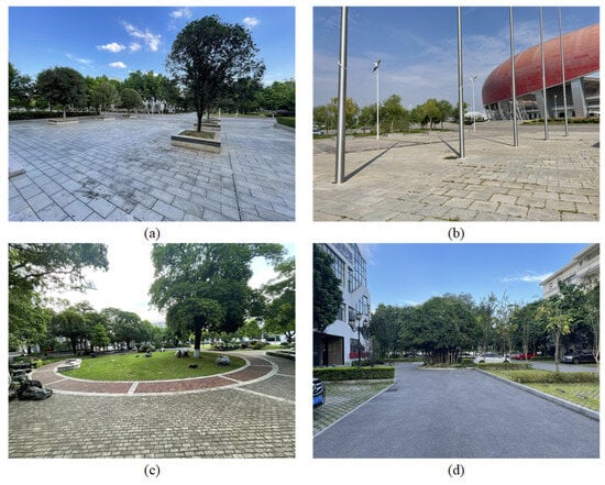 The experimental environment in real-world scenarios is shown in Figure 7. To ensure a variety of experimental conditions, four locations with different obstacles were selected. As depicted in Figure 7a, square flower beds with sides ranging from 1 to 2 m were chosen as obstacles. Figure 7b shows cylindrical flagpoles with a diameter of approximately 50 cm as obstacles. These two scenarios allow for the evaluation of the algorithm’s reconstruction performance on obstacles of varying sizes. Figure 7c,d depict two more complex terrains with minimal obstacles along the road surface. Since the algorithm primarily constructs the grid map by fitting the ground plane, these scenarios were selected to test the algorithm’s reconstruction capabilities for road surfaces.