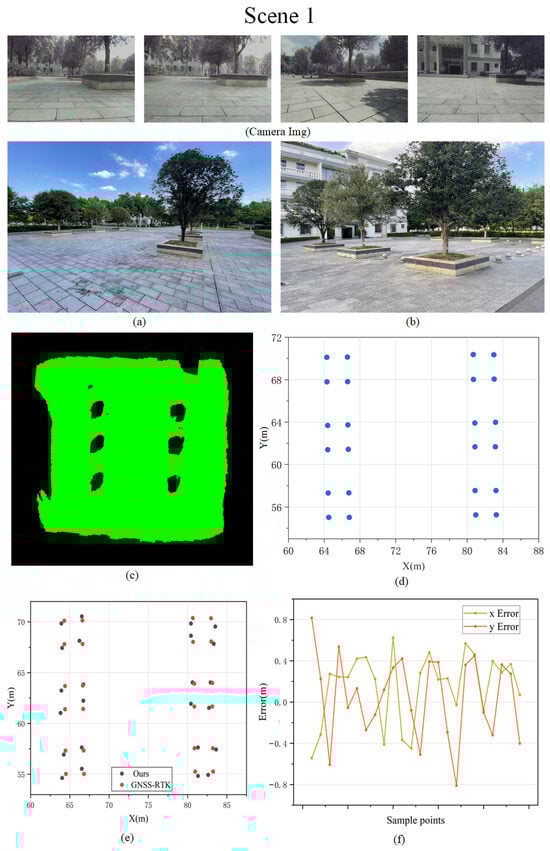 The scenes shown in Figure 9a,b feature six square flowerbeds, each approximately 3 m on each side. An occupancy grid map measuring approximately 30 × 30 m was constructed for this scene, with the mapping results presented in Figure 9c. In this map, the green areas represent ground grids, while the black areas indicate the locations of the flowerbeds. Although a few small black areas yielded inaccurate mapping results, the positions of all flowerbeds were successfully reconstructed. However, the shapes of the obstacles could not be accurately reconstructed, as shown in Figure 9e, where the vertices of the flowerbeds do not form perfect squares.