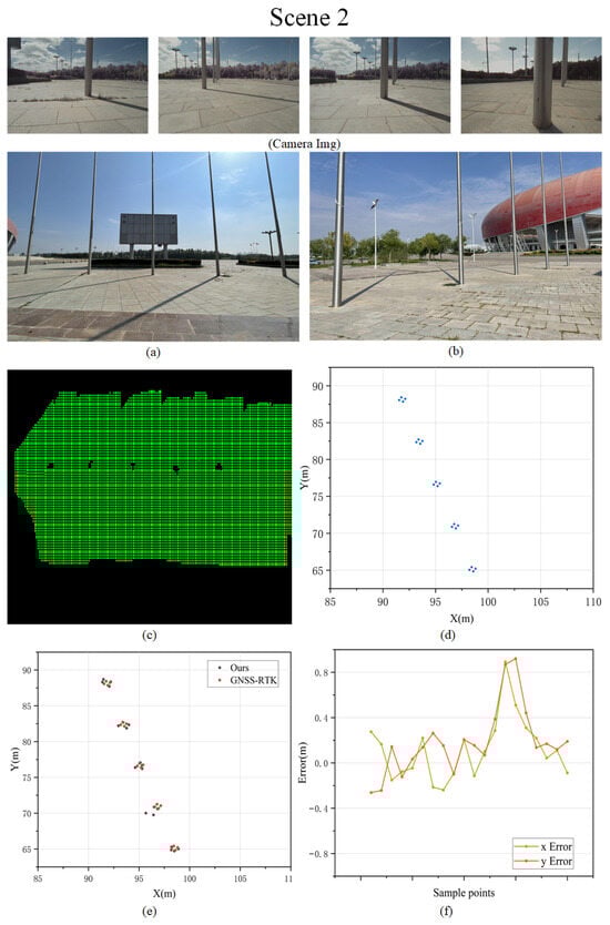 To assess the stability of the method, a more complex scene was selected to evaluate the reconstruction of the road surface. Unlike the previous scene, this scenario features a circular road within a park, bordered by stone steps and a lawn. The road width is approximately 3.5 m, with a total length of about 100 m. As shown in Figure 12c, the road surface was successfully reconstructed, with the exception of the areas marked in red. These regions, located at the boundary between the lawn and the road, are where semantic segmentation fails to generate accurate semantic masks, leading to some lawn areas being mistakenly classified as road surface. Landmark points were selected along the inner and outer edges of the road, including the apex, corners, and junctions, as easily identifiable reference points. Figure 12e illustrates the discrepancies between the positions of these landmark points in the map and their actual locations. As shown in Figure 12f, the majority of the landmark point errors are within 0.5 m. The data in Table 1 represent the root mean square error (RMSE) of our mapping method across four distinct scenes.