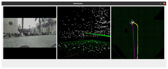 Figure 14 presents the interactive interface of the navigation system, comprising three windows. From left to right, these windows display the vehicle’s front view, sparse map points, and an occupancy grid map. The map window displays the vehicle’s real-time position and orientation, along with yellow dots indicating its movement trajectory. Additionally, users can interact with the map window by zooming in and out using the mouse scroll wheel. Each green point on the map is clickable. Users can double-click the right mouse button to select a starting point and an intermediate point. A path is then planned based on these two points, as illustrated in Figure 15. The white trajectory represents the output of the path-planning algorithm. Subsequently, the vehicle follows the planned trajectory to reach its destination.