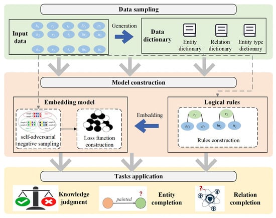 In the data sampling layer, several data dictionaries and logical rules are constructed according to KG information. Subsequently, the vectorization of entity, relation and entity type is realized according to these data dictionaries and word2vec model. In the model construction layer, embedded learning model is constructed based on the vectorization above, and the logic rules of vectorization are embedded in the embedded learning model to guide the training direction. In the tasks application layer, the optimized model is trained for different KG inference tasks. For knowledge judgment task, the optimized model is trained while considering the constraint of logic rules. For entity completion task, the optimized model is trained using positive and negative samples generated by entity and entity type replacement. For relation completion task, the optimized model is also trained with positive and negative samples, which are generated by relation replacement.