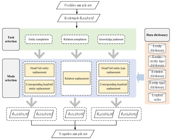 The flow of the negative sample generation method is shown in Figure 3 below. For example, for the entity replacement based negative sample generation method, the training data set is constructed including entity dictionary, entity type dictionary, entity-entity type dictionary, and quintuple dictionary. For each five-tuple in quintuple dictionary, random head entity replacement (h -> h′ or t -> t′) is performed based on the constructed entity dictionary. Simultaneously, the entity type is replaced based on the constructed entity-entity type dictionary to ensure that the entity-entity type is correct, which is convenient for the subsequent model training based on logical rules. The replaced quintuple is filtered by the quintuple dictionary to ensure that the replaced quintuple is a negative sample. In this process, the function of the quintuple dictionary is to ensure that the generated sample is negative. The purpose of the entity dictionary and the entity-entity type dictionary is to ensure that when an entity is replaced, its entity type is replaced accordingly. For the negative sample generation based on entity replacement and entity type replacement, in essence, the two parts of entity and entity type are replaced. The reason is that the essence of the model training process based on embedded learning is to express and train the relation between <head entity, relation, tail entity> in vector space, and entity type does not participate in it. Therefore, the negative samples generated by simply replacing the entity type are still positive samples in essence, and only the samples generated after replacing the entity or relation can participate in the model training process as negative samples.