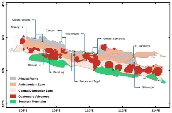 The physiography of Java is mainly divided into five elements, which are the southern mountains, Quarternary volcanoes, Central Depression Zone, anticlinorium zone, and alluvial plains (Figure 1). These elements dissect the island in the north–south direction []. The southern part is indicated by the southern mountains. The Central Depression Zone of Java consists of alluvial deposits and Pleistocene sediments [,,], alternating with Quaternary volcanoes, and the middle part of Java consists of the anticlinorium region. The alluvial deposit spreads along the northern part of Java, and the eastern part is dominated by anticlinorium formations. The width of the alluvial deposit in the northern part of Java varies between several km and 40 km, with a thickness of about 300 m []. A detailed geological map shows that alluvial deposits are found in several places, such as in the Bandung area.