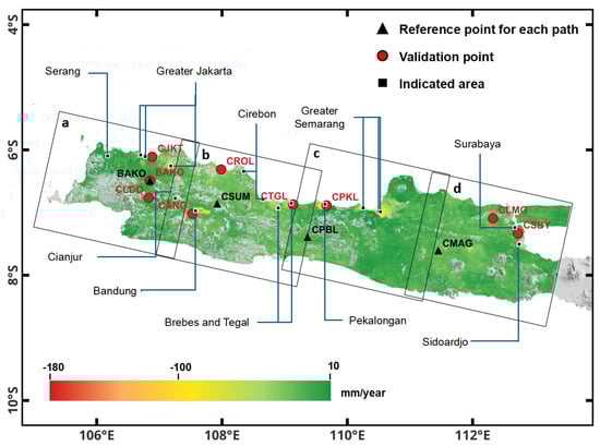 Rate of LS in Java. This map shows the annual subsidence rates measured in mm/year. The red dots indicate the CORS position used for validation; the black boxes represent the data track of InSAR, with (a) track 047, (b) track 149, (c) track 076, and (d) track 003; the black triangles show the reference points that are used for each track.
