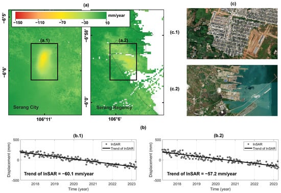 LS in Serang City and Serang Regency: (a) Map of LS rate in mm/year; (b) Time series of LS retrieved from InSAR (2017–2023) in: (b.1) Serang City and (b.2) Serang Regency; and (c) land use of the region highlighted in black box areas, (a.1) which correspond to residential housing in Serang City (c.1) and (a.2) which correspond to industrial complexes in Serang Regency (c.2). Optical satellite imagery in this study is sourced from Google Earth.