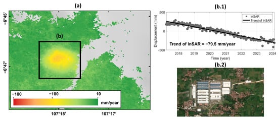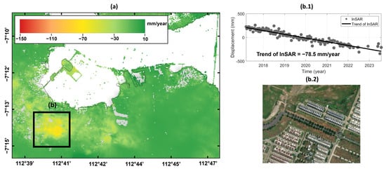 LS in Surabaya: (a) LS rate in mm/year in Surabaya area; (b.1) LS time series retrieved from InSAR from 2017 to 2023; and (b.2) land use of the region highlighted in the black box (b).