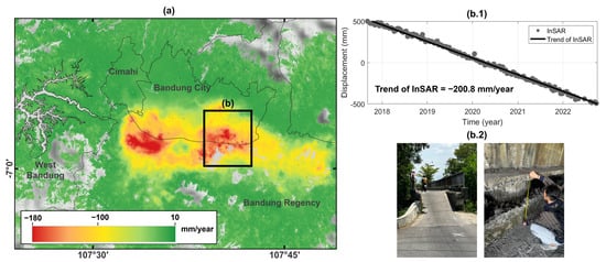 LS in Bandung: (a) LS rate in mm/year in the Bandung area; (b.1) LS time series retrieved from InSAR from 2017 to 2023; and (b.2) the field condition of LS in the region highlighted by the black box (b).