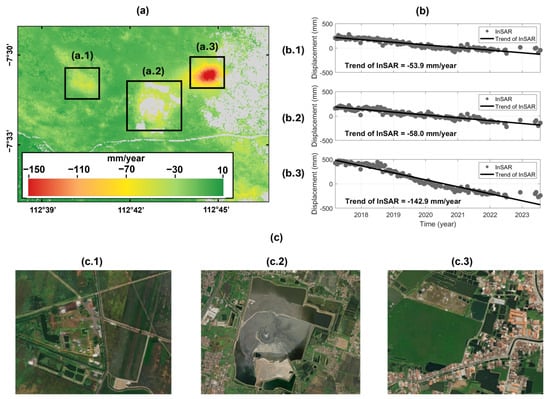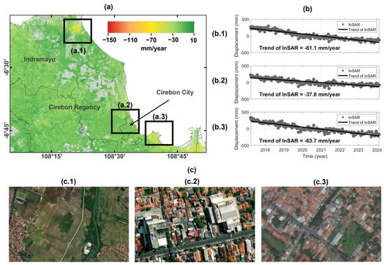 LS in Cirebon: (a) LS rate in mm/year in Cirebon; (b) LS time series retrieved from InSAR from 2017 to 2023 in Indramayu (b.1), Cirebon City (b.2), and Cirebon Regency (b.3); land use of the region highlighted in black boxes areas, (a.1) which correspond to residential housing and agricultural area in Indramayu (c.1), (a.2) residential and business area (c.2) in Cirebon City, and (a.3) residential housing in Cirebon Residence (c.3).