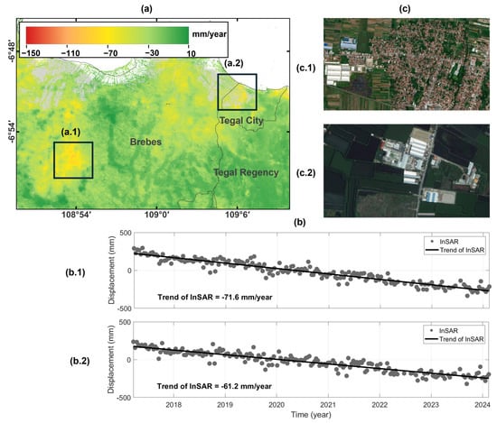 LS in Brebes and Tegal: (a) Map of LS rate in mm/year; (b) LS time series retrieved from InSAR from 2017 to 2023 in Brebes (b.1) and Tegal (b.2); and (c) land use in black box area (a.1) corresponding to residential housing and industrial area in Brebes (c.1) and (a.2) corresponding to industrial complexes in an agricultural zone in Tegal (c.2).