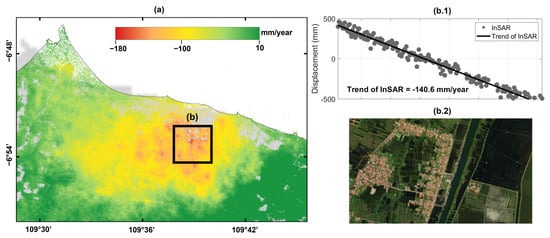The LS in Pekalongan has also been considered significant for more than a decade, as studied by [,] using the geodetic method. The result of this study shows that the LS rate in Pekalongan is up to 140 mm/year in several areas (Figure 9(b.1)). Figure 9a shows that the rate has not slowed since 2017.