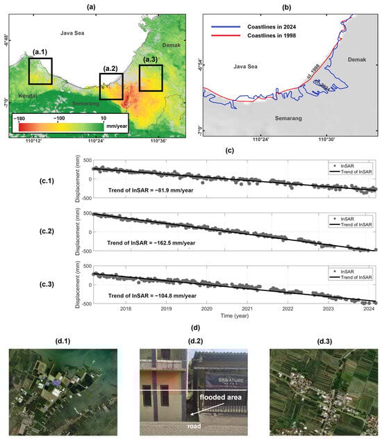 LS in Greater Semarang: (a) LS rate in mm/year in Greater Semarang; (b) the coastline shift between Semarang and Demak from 1998 to 2024; and (c) LS time series retrieved from InSAR from 2017 to 2023 in Kendal (c.1), Semarang (c.2), and Demak (c.3); (d) Land use or situation of the region highlighted in the black box, (a.1) which correspond to industrial areas in the coastal area in Kendal Regency(d.1), (a.2) lowering of the housing floor level in the Northern Coast of Semarang (d.2), and (a.3) the agricultural area in Demak (d.3).
