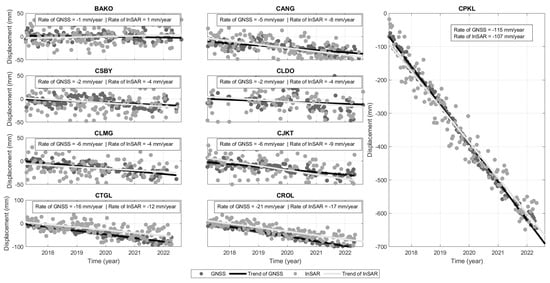 The results indicate that several areas experience deformation, as shown in Figure 2. The green area shows relatively no changes in the LOS, while the yellowish to red areas show the elongation of the LOS during the data acquisition period, which is assumed to be highly correlated with LS. It has been identified that 10 locations experience LS. From the west to east part of the Java, based on the administrative region, the areas that have a significant signature of LS are (a) Serang*, (b) Greater Jakarta (including West Jakarta, North Jakarta, East Jakarta, South Jakarta, Centra Jakarta, Tangerang City, and Bekasi), (c) Cianjur*, (d) Bandung*, (e) Cirebon, (f) Brebes and Tegal, (g) Pekalongan, (h) Greater Semarang (including Kendal, Semarang and Demak), (i) Surabaya, and (j) Sidoardjo. Meanwhile, subtle signatures of LS were found in Subang and Pamanukan, Indramayu, and Nganjuk. Several new locations that experience LS have been found in this study, in addition to the regions reported in the previous study [,]. The regions indicated with an asterisk are not on the northern coast of Java, while almost no LS is detected in the southern part of Java.