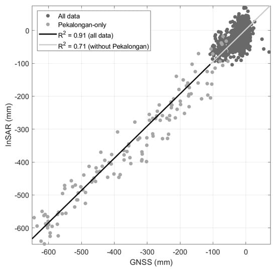 To generate subsidence maps in Java Island from SAR data, small-baseline criteria have been used to form interferograms and estimate the cumulative subsidence relative to a primary date []. The LS rate is then calculated using a linear model from the estimated cumulative subsidence.