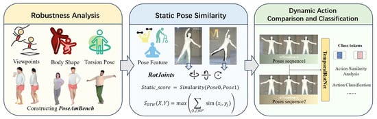 Recent advancements in pose comparison methodologies can be broadly categorized into two main approaches. The first approach employs classification models to determine whether two poses are identical or distinct [5]. The conventional frameworks for action recognition and classification predominantly utilize skeletal data for prediction, including models such as ST-GCN [6], 2s-AGCN [7], MST-GCN [8], and Skeletal-GNN [9]. However, this method is evidently limited in granularity, as it merely offers a binary judgment rather than a detailed comparison [10]. Moreover, this approach is constrained by the finite set of actions in the training data, making it necessary to substantially modify both the dataset and model architecture to recognize new, unseen actions [11], making zero-shot action classification [12,13] particularly challenging. This limitation significantly impedes the straightforward customization of a standard action library [14,15]. The second approach focuses on the computation of similarity metrics based on extracted pose features [4,16]. These methods refer to articulated skeletal points capable of movement as joint nodes, such as shoulder and knee joints, and regard them as key pose representation features. During the pose estimation stage, these methods first predict the positional parameters of these joint nodes, which serve as the foundation for subsequent similarity computations. Traditional methods in this category predominantly rely on 2D and 3D skeleton-based models [17,18,19], where comparisons are made by calculating either the angular differences between corresponding joint vectors or the Euclidean distances between corresponding joint nodes [20,21,22,23]. However, as depicted in Figure 1, these methods are often hampered by variations in human body morphology and camera angles, which can alter both the angles between joint vectors and the spatial positions of joint nodes. Furthermore, the skeletal model’s inherent limitations in representing the full complexity of human poses can lead to significant ambiguities in the comparison process.
