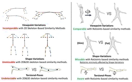 (Left) Pose comparison method based on skeleton features. (Right) Pose comparison method based on RotJoints. Comparison of their robustness in pose matching tasks under shape variation, viewpoint changes, and torsional poses. The red text highlights ambiguities inherent to traditional methods, while the green text demonstrates how our approach resolves these ambiguities.
