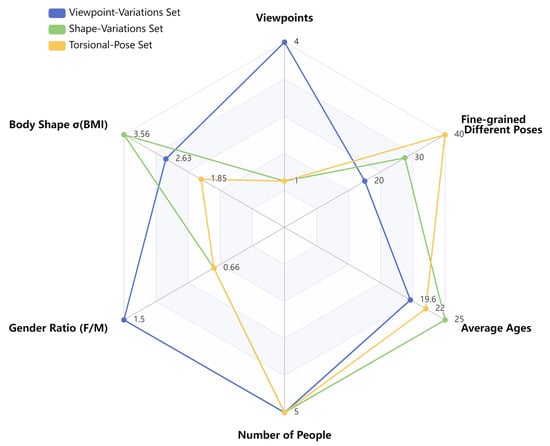 Based on the design guidelines, we categorize the data into three sets: (1) Shape-Variations Set, (2) Viewpoint-Variations Set, and (3) Torsional-Pose Set. The target data are selected and defined according to standards that best reflect the ambiguities in pose similarity differentiation methods. For the Shape-Variations Set, we select 30 action groups, with full-body frontal photos taken by five individuals of varying body types (tall, short, lean, and stocky). The same action performed by different individuals is labeled as having consistent poses. For the Viewpoint-Variations Set, we select 20 action groups, each performed by five individuals with full-body photos taken from different angles, including front, side, 45° oblique, and top-down views. The same individual performing the same action is defined as having consistent poses across different viewpoints. For the Torsional-Pose Set, we first design 10 basic actions, upon which we introduce varying degrees of arm and leg torsion. Five individuals are photographed performing these actions from consistent viewpoints. The labeling for this set is more complex and will be elaborated on in the metrics section. After filtering, a total of 980 action pairs are selected. Detailed statistical information is shown in Table 1 and Figure 3.