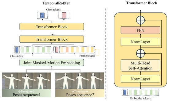 Firstly, the model employs an attention-based architecture to capture semantic and temporal dependencies within motion sequences. By utilizing a Transformer encoder, TemporalRotNet efficiently processes sequential data and extracts multi-level feature representations. Second, to enhance the model’s robustness and generalization capabilities, we introduce a joint masking mechanism. This mechanism randomly masks certain joints in the input motion data, simulating real-world scenarios where partial joint information may be missing or noisy, thereby improving the model’s adaptability to incomplete data.