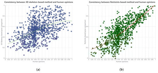 Relationship between the results of (a) 3D skeleton-based and (b) RotJoint-based methods and human opinions on pose similarity, presented in the form of a scatter plot with a third-degree polynomial fit.