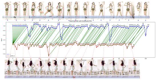 where i and j are the indices corresponding to points in sequences X and Y, respectively, and the path is chosen to maximize similarity. To demonstrate the reliability of the RotJoint-based method in temporal action matching, we conducted tests on videos of the same individual performing the same action at varying speeds, recorded from different viewpoints. Fifty single-person motion videos, each with an average duration of 2 min and a frame rate of 1 fps, were used. The original videos played at 1× speed, while the comparison videos were divided into 4–5 segments, with speeds ranging from 0.1× to 2×. The average score achieved was 0.996. In a more complex scenario involving different individuals performing the same action at varying speeds and viewpoints, like Figure 6, we obtained a score of 0.909 using the same setup.