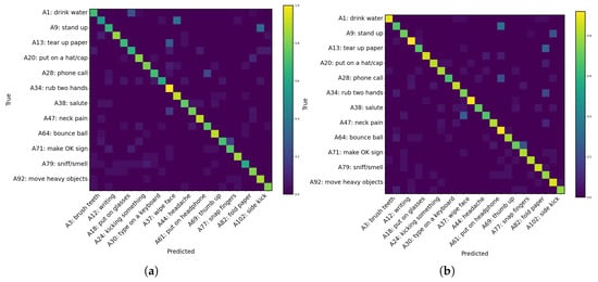 The confusion matrices on the left and right, respectively, represent the ablation experiments conducted using (a) 2D and (b) 3D skeleton features. For clarity, 24 randomly selected samples are displayed. The vertical axis indicates the labels at odd positions, while the horizontal axis indicates the labels at even positions.