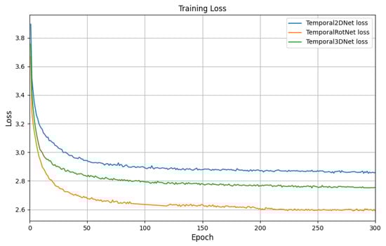Comparison of the training loss between Temporal2DNet, Temporal3DNet, and TemporalRotNet.