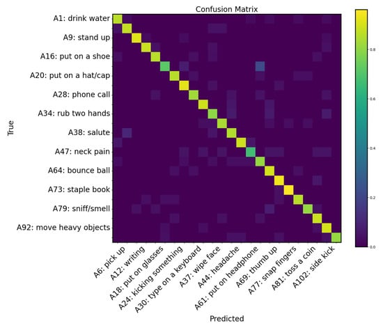 As shown in the confusion matrix in Figure 9 and the results in Table 6, the accuracy was 88%, indicating that the dynamic training based on RotJoint features performed well, and the network was able to effectively integrate information from both static and dynamic aspects. Even for unseen actions, the model can extract sufficient motion and temporal features for classification. We note that while 2s-AGCN achieves the same accuracy as our method, both 2s-AGCN and TRNet have computational complexity proportional to the square of the sequence length. However, with the specific optimization of the Transformer’s FlashAttention module [55], our method completes inference in 22.8 ms on an NVIDIA 3090 GPU (NVIDIA, Santa Clara, CA, USA) for a 2 s video at 60 fps, whereas 2s-AGCN, which lacks hardware acceleration for specific components, requires 40.2 ms. Additionally, 2s-AGCN is constrained by a fixed sequence window length, while TemporalRotNet can adapt to sequences of varying lengths, making it more effective for large-scale sequence data. Under the open-set setting, 2s-AGCN converged after 320 epochs, while TemporalRotNet required only 250 epochs.