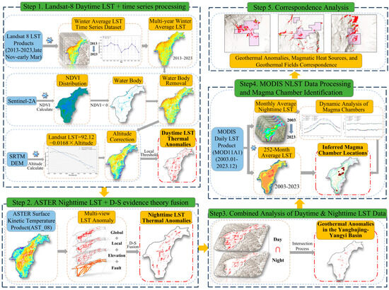 Schematic diagram of the geothermal anomaly detection workflow using multi-source LST data. The workflow involves the following steps: (1) Processing of Landsat-8 daytime LST time series data; (2) Multi-view extraction of ASTER nighttime LST data combined with Dempster–Shafer (D–S) evidence fusion; (3) Integrated analysis of the intersection between daytime and nighttime LST data; (4) MODIS long-term LST data are utilized to infer magmatic activity and heat source distribution; (5) Correlation analysis and result validation using geological information.