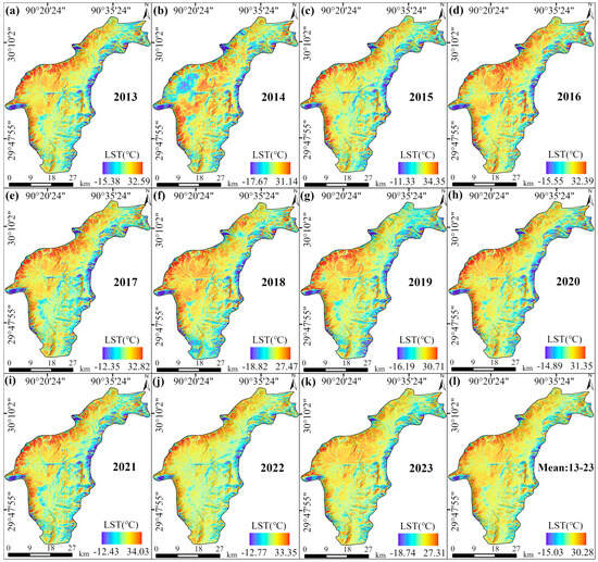 Time series of daytime winter average LST in the Yangbajing–Yangyi Basin from 2013 to 2023, based on Landsat-8 data acquired between November and March. Subfigures (a–k) show the average LST for each winter season from 2013 to 2023, while subfigure (l) presents the multi-year average LST across all winters. LST values are represented using a blue-to-red color gradient, where blue indicates lower temperatures and red indicates higher temperatures. Units are in degrees Celsius.