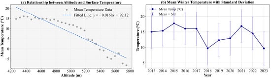 (a) Relationship between Altitude and Surface Temperature in the Study Area; (b) Changes in Winter Average Surface Temperature and Standard Deviation from 2013 to 2023.