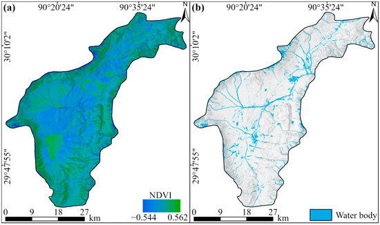(a) NDVI distribution map of the study area derived from Sentinel-2A data; (b) Water body distribution map extracted using the condition NDVI < 0.