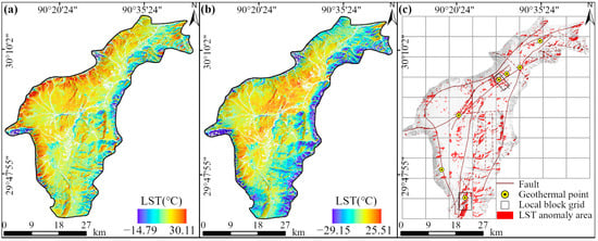 As shown in Figure 3a, LST decreases with elevation, with a temperature difference of approximately 20 °C between the highest and lowest elevation zones. The elevation-corrected image is presented in Figure 6b. After correction, the LST range was adjusted to −29.15 °C to 27.18 °C, with a mean of 6.2 °C and a standard deviation of 6.6 °C. Using the corrected data, the local block threshold method was applied to extract daytime high-temperature LST anomaly regions (Figure 6c). The identified anomalies are primarily distributed along fault zones and correspond well with known geothermal hotspot locations.