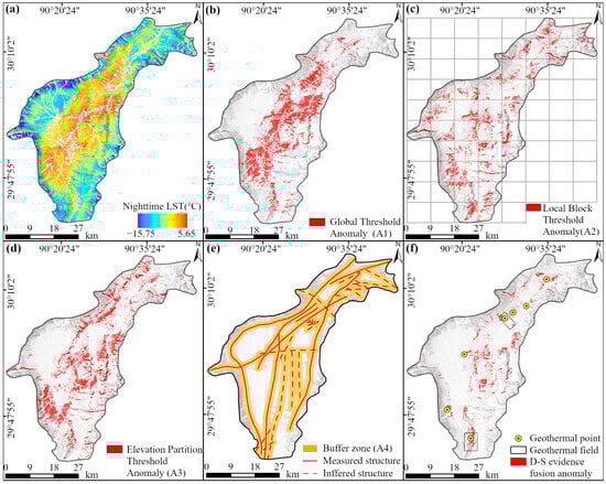 (a) Nighttime LST product; (b) Geothermal anomaly results obtained using the global threshold method (A1); (c) Geothermal anomaly results using the local block threshold method (A2); (d) Geothermal anomaly results derived from the elevation partition threshold method (A3); (e) Fault structural buffer zone (A4); (f) Geothermal anomaly results obtained from D–S evidence fusion.