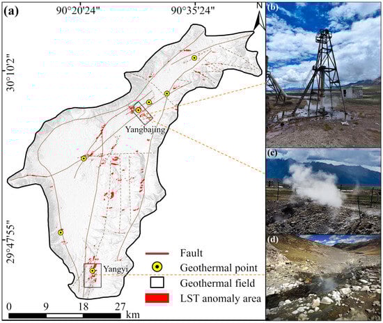 (a) Geothermal anomaly results obtained through the combined analysis of daytime and nighttime LST data; (b) Boreholes emitting boiling geothermal water. Latitude: 30.06° N, Longitude: 90.48° E; (c) Boiling Spring. Latitude: 30.07°N, Longitude: 90.49°E; (d) Boiling spring, Cited from [58].
