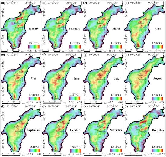 Figure 9 illustrates the spatial variation in monthly average LST across the study area from 2003 to 2023. Although the distribution of temperature anomalies varies slightly across months, they remain primarily concentrated in the Yangbajing and Yangyi geothermal fields, where monthly average temperatures are significantly higher than those in the surrounding areas.