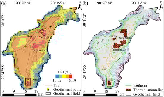 Figure 10a presents the monthly average LST data over 252 months, revealing the general surface temperature distribution in the study area. The central region exhibits higher temperatures, while the surrounding areas show relatively lower values. The figure highlights four significant temperature anomaly zones: the Yangbajing Geothermal Field, the Yangjingxue area, the southern part of Regaguo, and the Yangyi Geothermal Field, with areas of 17.08, 26.19, 3.02, and 4.99 km2, respectively.