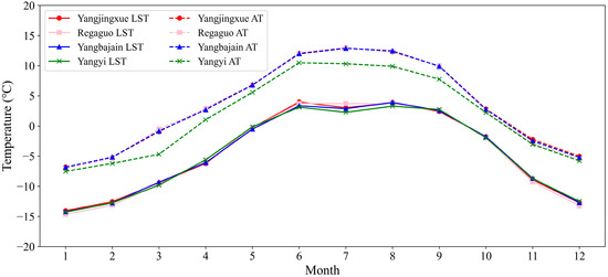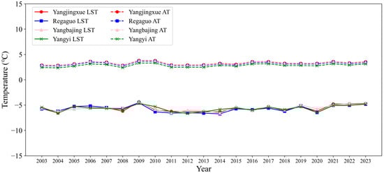 To further investigate the activity characteristics of potential magma chambers, this study analyzes annual and monthly variations in the multi-year average land surface temperature (LST) of geothermal anomaly zones from 2003 to 2023, aiming to reveal temporal patterns in geothermal dynamics. Monthly average air temperature (AT) data were also obtained from the National Earth System Science Data Center [56] and compared with LST data to analyze the causes of geothermal anomalies and further examine the temporal evolution and activity of subsurface magma chambers.