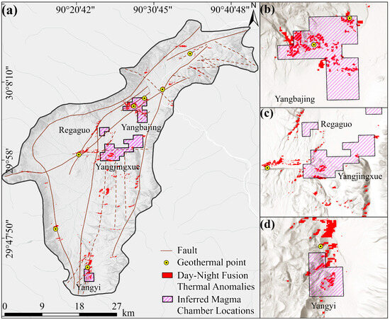 Figure 8a highlights regions that consistently exhibit high temperatures during both daytime and nighttime, considered as theoretical true geothermal anomalies. The results indicate that these anomaly zones align with major fault structures, demonstrating strong spatial consistency. They closely correspond to the locations of the Yangbajing and Yangyi geothermal fields, along with several known hot springs (Figure 8b–d), further confirming the role of fault structures in controlling geothermal anomaly distribution.