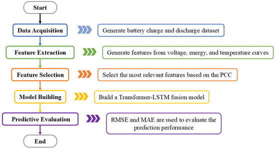 To this end, this paper proposes an innovative method based on multidimensional features and a transformer–LSTM fusion model. This method first extracts multiple features from the battery charge and discharge cycle data, including voltage, energy, and temperature curve time domain, frequency domain, and time dimension features. Subsequently, the local outlier factor (LOF) algorithm is used to identify and remove outliers in the data, and data smoothing is performed through linear interpolation and a Savitzky–Golay filter, thereby effectively improving the data quality. Next, the features most relevant to SOH are selected through correlation analysis as model input. In order to further improve the accuracy and stability of SOH prediction, we constructed a transformer–LSTM fusion model, combining the self-attention mechanism of transformer and the long-term dependency capture capability of LSTM. To verify the effectiveness of the model, we used 124 battery datasets generated under 72 different fast-charging conditions for training and testing. The experimental results indicate that the proposed model exhibits superior performance in SOH prediction and demonstrates strong generalization capability. The SOH prediction process is shown in Figure 1.