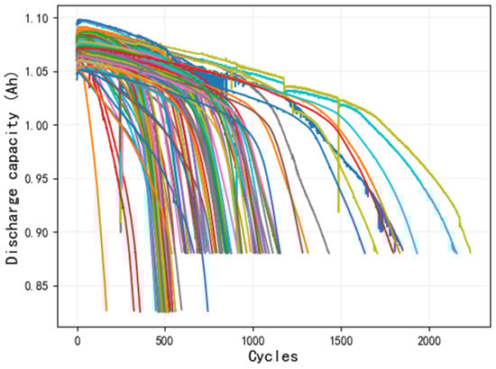 The dataset used in this paper is the MIT battery dataset, developed by Severson et al. [] in 2019, which is the largest publicly available dataset for long-term battery degradation studies. The dataset contains 124 A123 lithium iron phosphate/graphite batteries, each with a rated capacity of 1.1 Ah (A123 Systems, Hangzhou, China). When the battery capacity decays to 80% of the rated capacity, it is considered that the battery has reached the end of its service life. All batteries are charged using 72 different multistep fast-charging strategies and discharged at a constant current in a constant-temperature chamber at 30 °C. The dataset records the long-term battery degradation process from 150 to 2300 cycles and was tested in a real physical environment, which can truly reflect the performance changes of lithium batteries in long-term use. The capacity degradation curve of the MIT dataset is shown in Figure 2.