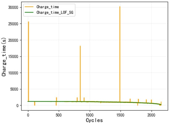 Feature curves are often affected by noise and fluctuations, resulting in outliers and uneven curves. To solve this problem, we used the LOF algorithm [] to detect outliers effectively and replace them with linear interpolation. Additionally, the Savitzky–Golay filter [] is applied for data smoothing to enhance feature quality. Figure 4 shows the effect of feature data after processing. In the original yellow curve, the outliers are corrected by linear interpolation and then filtered to form a smooth curve. This process effectively removes noise and abnormal fluctuations in the data and improves the quality of the feature data.