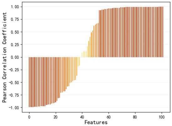 In order to evaluate the correlation between the extracted features and the battery SOH, we used the Pearson correlation coefficient for analysis. The Pearson correlation coefficient is a statistical indicator that measures the strength of the linear relationship between two variables. Its value range is [−1, 1], where positive values indicate positive and negative values indicate negative correlations. The closer the absolute value is to 1, the stronger the correlation. We calculated Pearson correlation coefficients between 102 features and the battery SOH, and the results are shown in Figure 5. The analysis results show a significant correlation between most features and the battery SOH, and the absolute values of the correlation coefficients of these features are close to 1, which further verifies the representativeness and effectiveness of these features. It can be seen that the extracted features can not only reflect the health status of the battery but also provide reliable input for SOH prediction. The calculation method of the Pearson correlation coefficient is shown below: