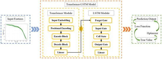 Achieving reliable SOH prediction requires effectively dealing with significant inconsistencies and complex nonlinear problems in battery degradation. Battery degradation is not only influenced by various intrinsic mechanisms but is also heavily influenced by external environmental factors and operating conditions, resulting in highly uncertain degradation patterns across different batteries. In addition, as the battery life increases, the degradation rate may vary in stages or even accelerate unexpectedly, which makes the relationship between feature data and SOH complex and nonlinear. These complexities pose great challenges to a prediction model in terms of expressiveness and robustness. To tackle these challenges, this paper proposes a transformer–LSTM-based data-driven prediction method to enhance both the accuracy and robustness of SOH prediction. Figure 7 illustrates the structure of the transformer–LSTM fusion model.
