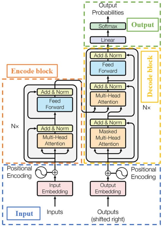 To better understand battery degradation trends and capture contextual insights, we utilized the transformer framework, as illustrated in Figure 8. The main components of the transformer model include the input embedding layer, positional encoding, encoder, decoder, and output layer. During training, the input embedding layer first converts the input sequence into a high-dimensional vector representation. It adds positional encoding to the embedding vector to maintain each position’s relative and absolute position information in the sequence. Next, the encoder uses the self-attention mechanism to process the input features and generate context-related representations for each position, thereby capturing long-range dependencies in the sequence. The decoder combines the output of the encoder with the previous prediction results and generates the final prediction sequence through self-attention and cross-attention mechanisms. The output layer maps the decoder results to predicted values. During training, the transformer uses backpropagation to optimize the loss function and adjusts layer weights to capture complex relationships in sequence data, enhancing prediction accuracy.